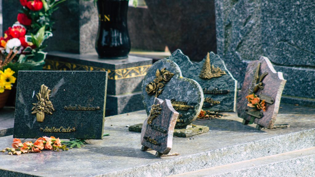 - Les plaques funéraires : en granit, en marbre, en pierre ou tout autre matériau, les plaques peuvent être ornées de gravures, de citations, d’épitaphes, de symboles ou même d’images.